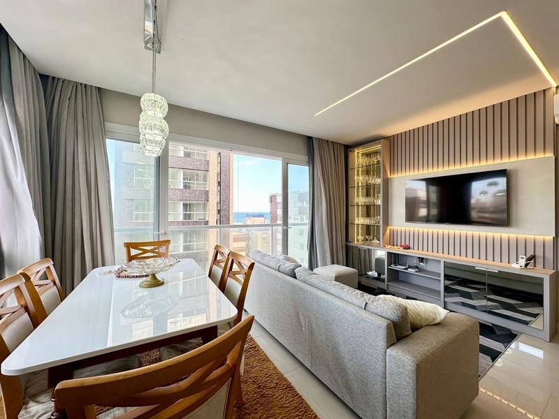 Apartamento novo, finamente mobiliado, decorado, equipado e climatizado, com 107m² de área privativa, living amplo com sala de jantar e estar integradas, cozinha em conceito aberto com churrasqueira, área de serviços separada, sacada de frente separada e lavabo. A parte intima além de um piso vínico, que proporciona mais conforto no dia a dia, é composta por três suítes individuais. Apartamento bem iluminado, possuindo a melhor orientação solar (Leste/Norte). O imóvel conta também, com dois amplos box de estacionamento e um depósito privativo. Edifício de altíssimo padrão construtivo, composto por uma arquitetura moderna e inovadora desde a fachada as áreas internas comuns, Rooftop no último andar com salão de festas, espaço gourmet, espaço pet, floreira, fire place, piscina com vista mar e serra, terraço perfazendo todas as extremas do edifício, portão e porteiro eletrônico, zeladora permanente, dois elevadores digitais e hall de entrada decorado. A localização é privilegiada: apenas uma quadra do mar e a poucos metros da linda praça Flávio Boianowisky. Entre em contato e agende uma visita.